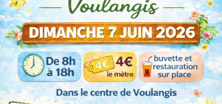 La mairie de Voulangis organise son vide-grenier le dimanche 7 juin 2026.Tarifs 4 euros/ml (minimum 4m). Inscriptions et renseignements : videgrenier@voulangis.fr Voici le formulaire d’inscription. Il est aussi disponible en mairie.